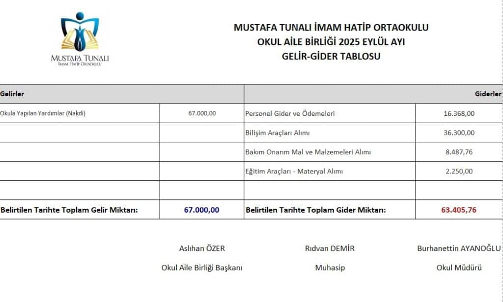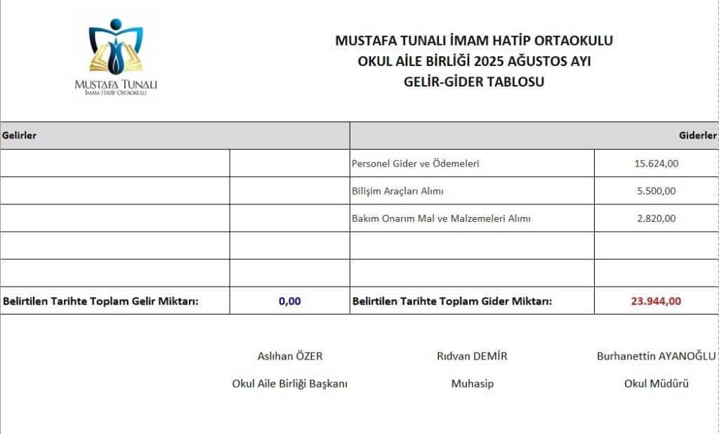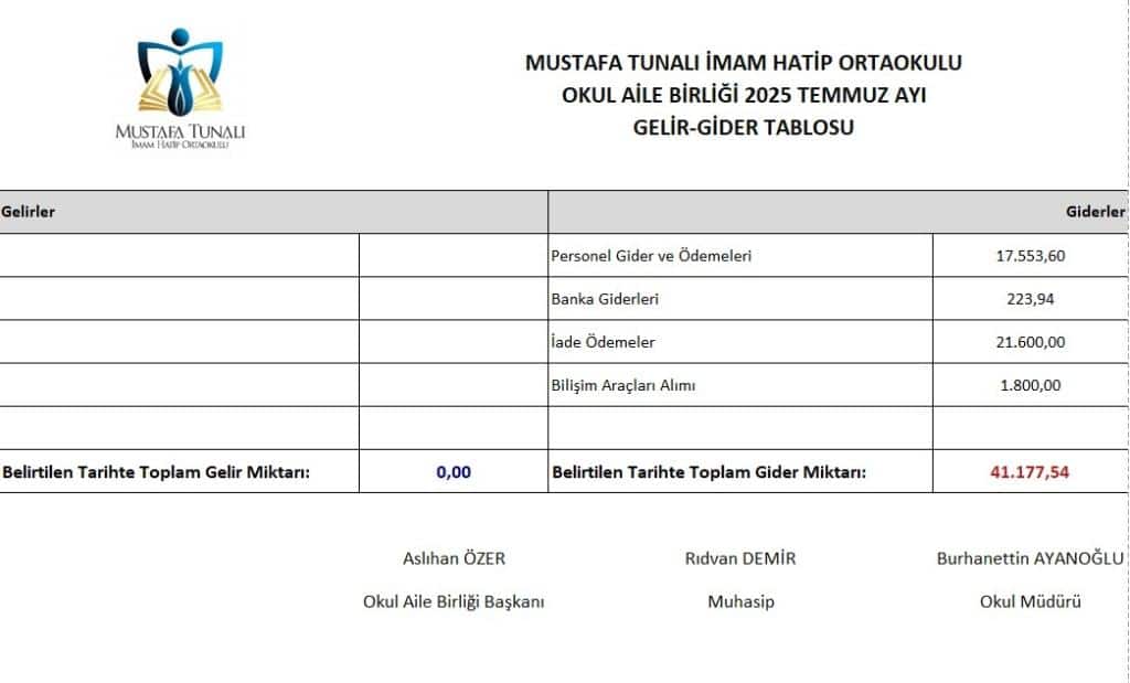 OKUL AİLE BİRLİĞİ TEMMUZ-AĞUSTOS-EYLÜL 2025 AYLARINA AİT GELİR GİDER TABLOSU EKTE BULUNMAKTADIR